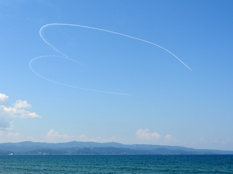 こちらは、前日(8月1日)午後2から行われた試験飛行の様子です。 この日は、松太枝浜海水浴場で見ていました。
