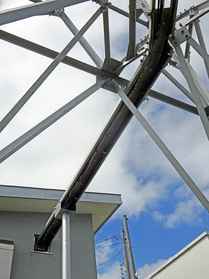 |  こちらは、2つの局舎を繋ぐラックです。 NHKの信号も一旦民放局舎を経由しています。 |  こちらは民放局舎と鉄塔をつなぐラックです。 |