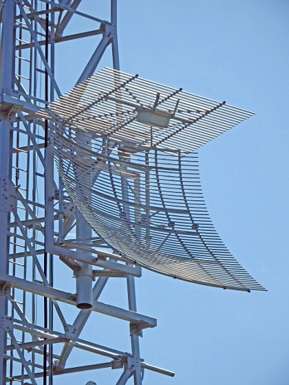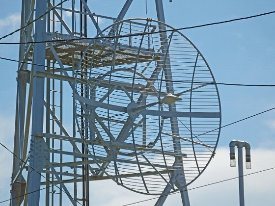 |  FM受信アンテナ(5素子八木2列)です。2基のパラボラの間にあります。 親局の中標津中継局が垂直偏波のため、アンテナが立っています。 |  先端近くに小型のアンテナがあります。 |