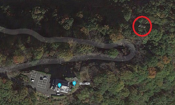 ![]() どこに在るのかと、グーグル航空画像で確認すると、展望台の北東側、 ヘアピンカーブのすぐ下のようです。 赤丸部分 |