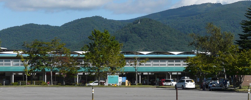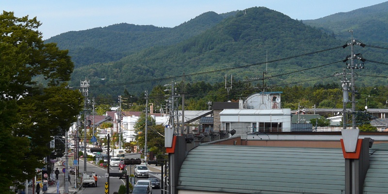 軽井沢駅南側のショッピングモール駐車場から見た遠景です。中継局は、中央の山です。