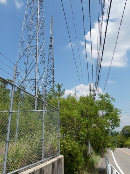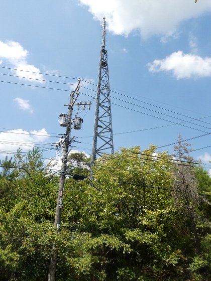 藤岡中継局は、豊田市深見町の水道施設の向かい側にあります。この辺りは高台になっており、携帯電話各社の鉄塔も並んで建っています。
