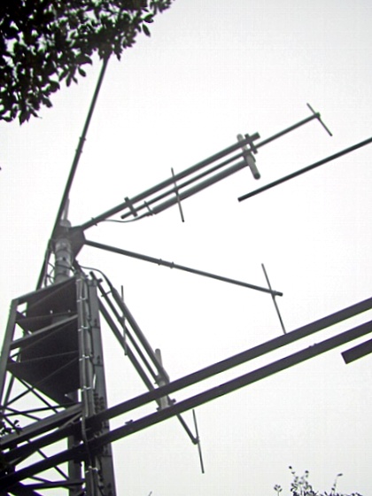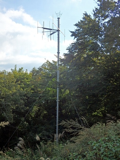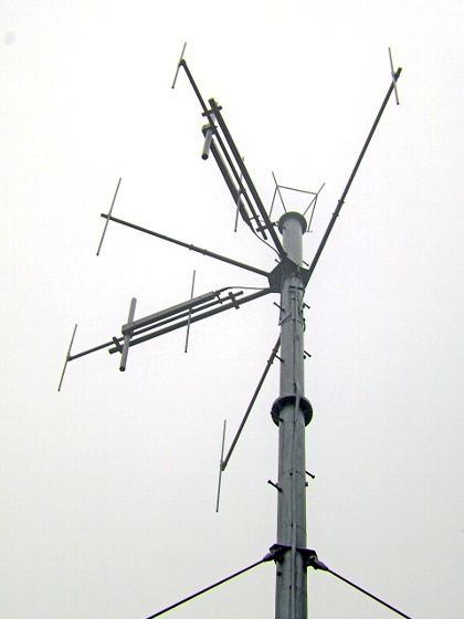 ![]() 送信アンテナを角度を変えて2枚。 3素子八木2面1段(垂直偏波)です。 なお、親局受信アンテナは、テレビ送信点敷地に5素子八木2列があります。 |