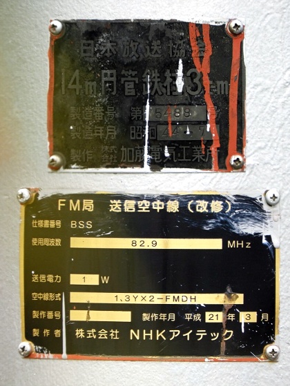 ![]() FM鉄塔の銘板です。16年前に改修されているようです。 |